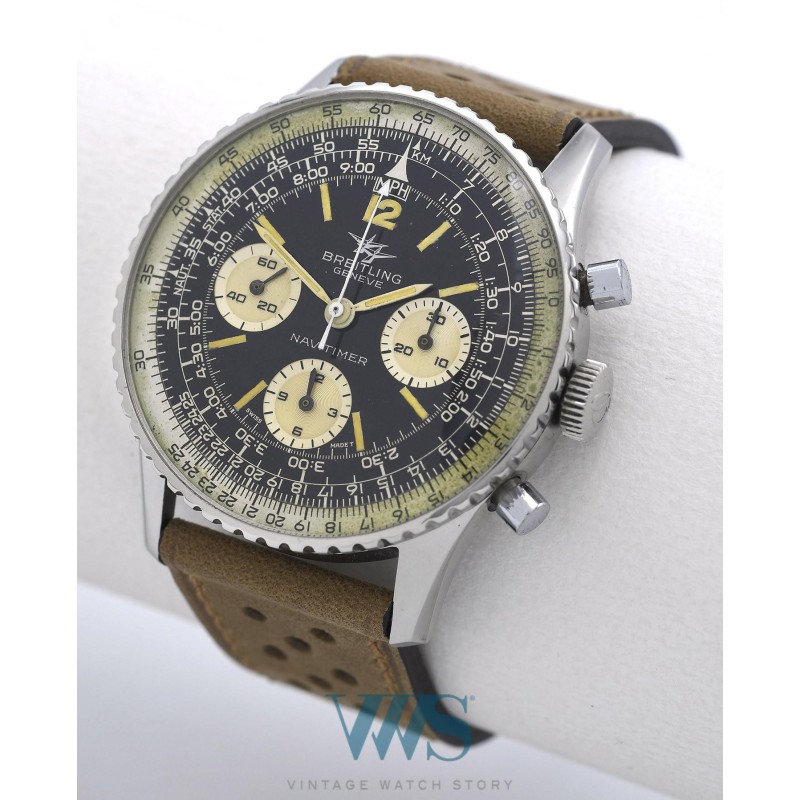 Boitier en acier à anses corne, lunette bidirectionnelle crantée multifonction (servant de règle à calcul) de couleur argentée (devenue patinée verte), fond clippé (signé et numéroté). Superbe cadran noir laqué avec le logo BREITLING à 12h, version trois petits compteurs en creux argentés, index peints patinés coquille d'œuf Tritium et aiguilles squelette luminescents. Fonctions : totalisateur des heures à 6h, petite seconde à 9h, minutes à 3h, trotteuse flèche du chrono au centre.