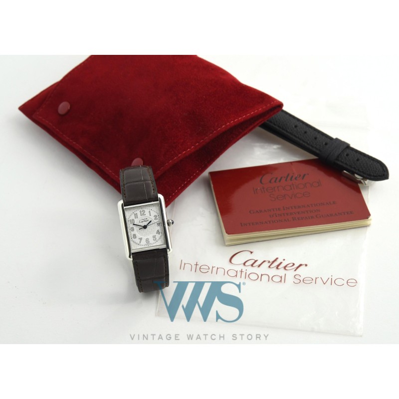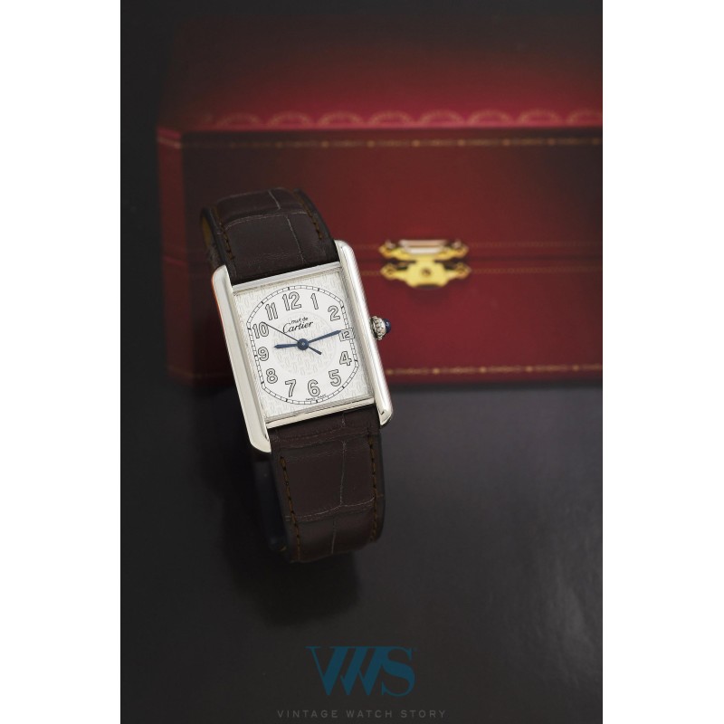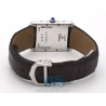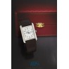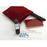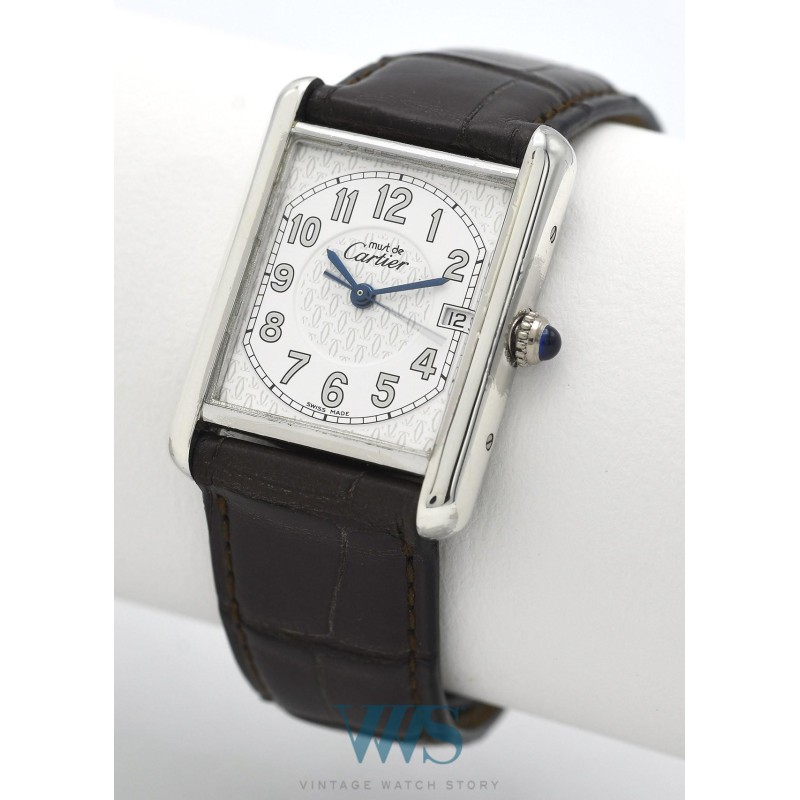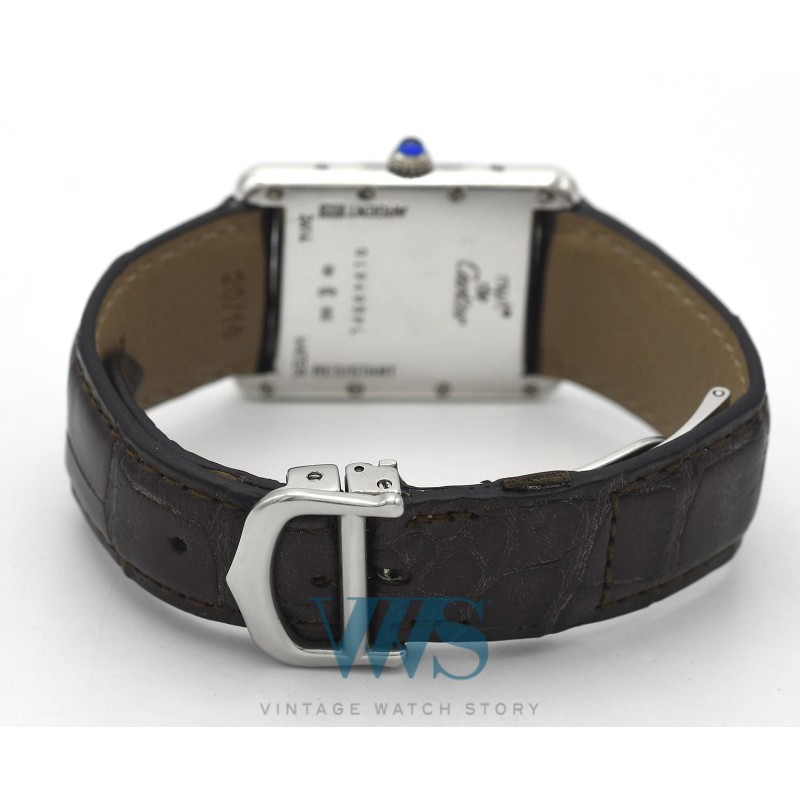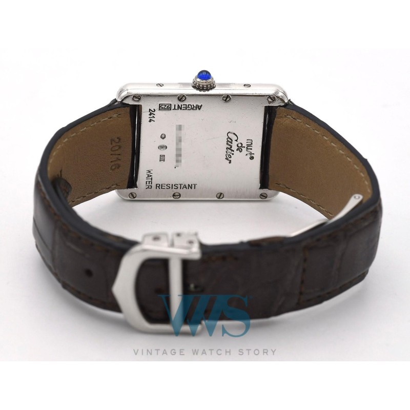 Boitier rectangulaire en argent (925 millièmes) à fond lisse et vissé sur la bande de carrure (poinçonné, signé et numéroté). Cadran argenté avec chemin de fer et monogramme Cartier, chiffres arabes gris, grande trotteuse seconde et aiguilles glaive en acier bleui. Guichet de date à 3h et remontoir cabochon en saphir.