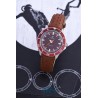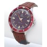 Boîtier rond en acier avec couronne à débordement et fond vissés (signé et numéroté, Waterproof). Exceptionnel état pour la lunette bidirectionnelle rouge bordeaux (patinée) et graduée sur 60 (avec perle à 12h). Cadran rouge Bordeaux avec index peints Tritium et aiguilles squelette luminescents, grande trotteuse des secondes rouge.