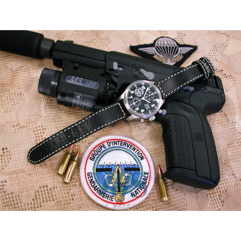 Boîtier grande ouverture en acier brossé à fond vissé hublot en verre saphir. Cadran noir mat à trois compteurs cerclés : seconde à 9h avec logo GIGN, minutes à 12h, heures et date guichet à 6h. Aiguilles squelette et chiffres arabes luminova pour la vision de nuit, grande trotteuse flèche. Livré avec 2 bracelets en cuir (noir et marron) et un 3ème bracelet acier siglé à boucle déployante.