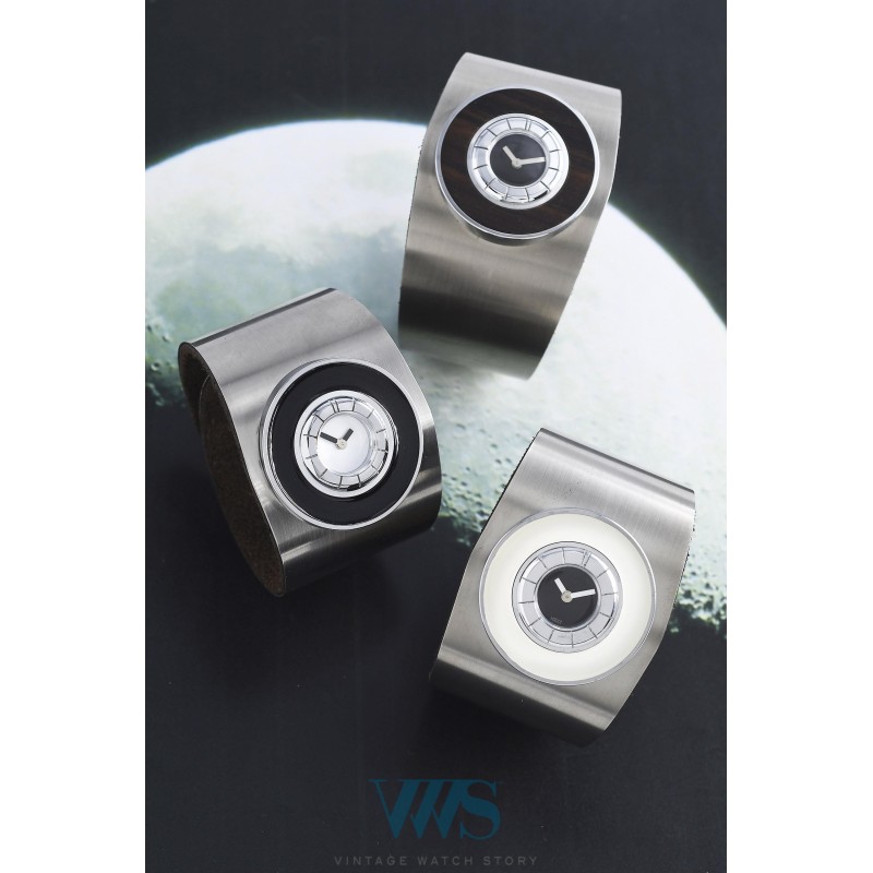 Rare watch 'full strap' design 70, wide chrome front disc in black epoxy. Round case with fluted bezel and white dial. Crown integrated in the back and bottom of case clipped. Large brushed steel bracelet, leather-wrapped and integrated into the case.