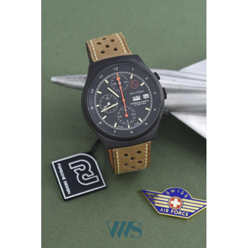 Rare version of the Porsche Design 7177 Military fighter pilot chronograph, series produced for NATO (complete written version from the workshops by Orfina). Produced in limited numbers by Orfina Suisse (under contract with Porsche Design at the time). Legend says that this chronograph range was worn by the actors in the movie Top Gun. A beautiful new version has just been reissued by Porsche Design.