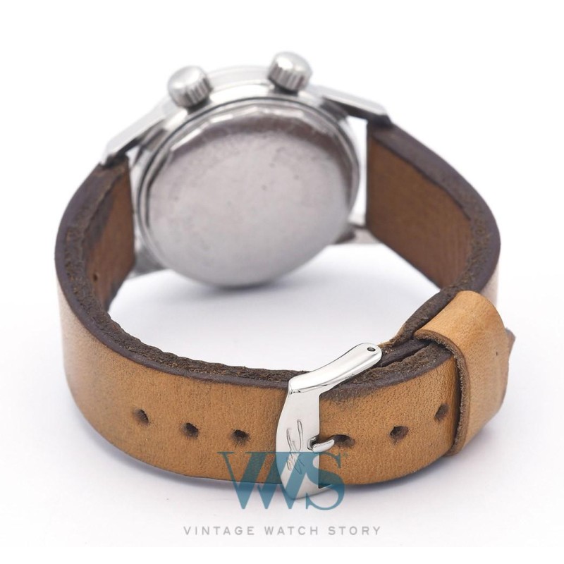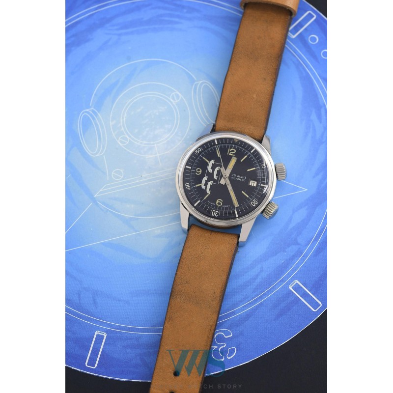 Black patinated dial with inner bezel graduated to 60 (operated by the crown at 2 o'clock, time setting by the crown at 4 o'clock). Faded tritium indexes and large luminescent spatula hands, large second hand and date window at 3 o'clock.