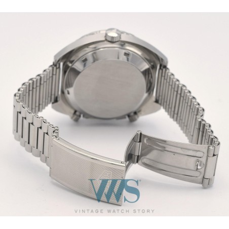 Large aperture barrel-shaped steel case and screwed back (signed Leonidas - Heuer and numbered). Large unidirectional blue fluted bezel graduated to 60 minutes (big triangle tritium). King blue dial with two counters, an oversized counter at 3 o'clock for the minutes (with "red-white-blue" colored sector from 5 to 5 minutes for the countdown of the time in race) and a small seconds counter at 10 o'clock, date window at 6 o'clock. Applied indexes, second hand and luminescent orange skeleton hands.